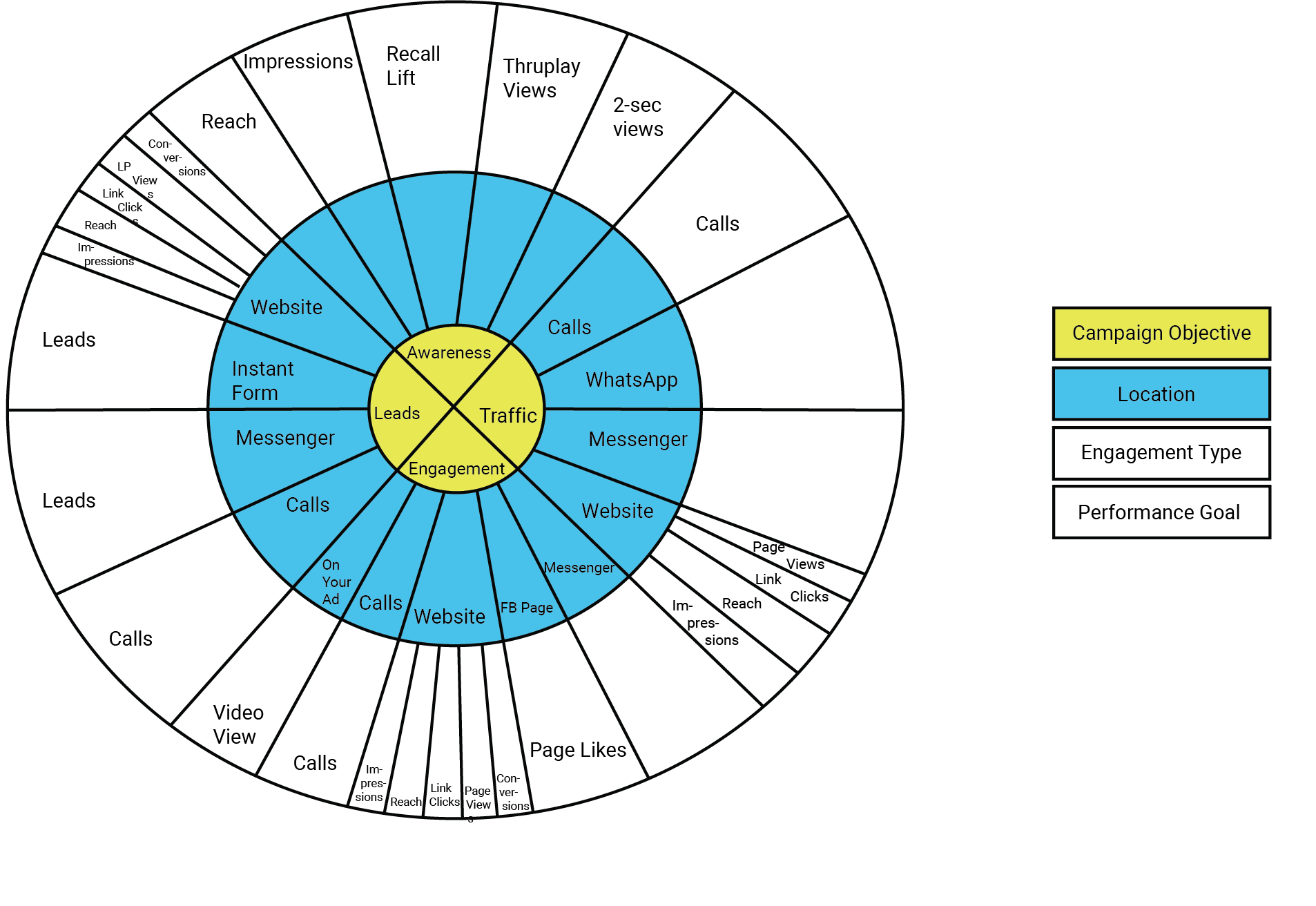 All it takes is a little preemptive campaign action, a small communication error or a staffing change and a brand’s entire PPC program can quickly become a mess. As you can see in the above graphic a performance goal of “link clicks” can be achieved in 3 different combinations of campaign objectives and locations.