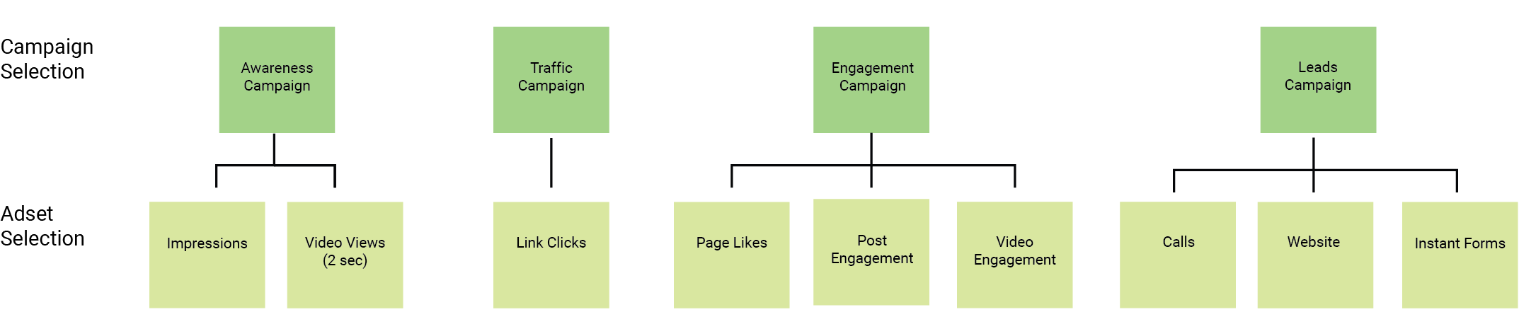 Let’s take a look at the current state of Facebook/Meta Ads. Today, PPC managers are tasked with navigating a byzantine menu of campaign and ad set setting possibilities that differentiate depending on the performance goal and chosen ad sets. The graphic below illustrates how many choices PPC managers have to make when setting up Facebook/Meta campaigns. The more choices presented, the easier it is to make errors or fail to set up multiple campaigns in an identical manner.